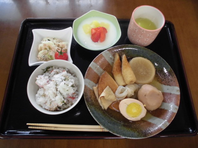 平成30年2月2日 温かおでん♪ おもやい 2018/02/02 16:44 冬と言えば、『おでん』ですね♡ 【おもやい】では、1月13日、今年はじめての自炊に『おでん』を作り、温かい『おでん』で入居者様に楽しんでいただきました♪ メニューは、『おでん』のほか、サラダ、梅しそごはん、杏仁豆腐です。『おでん』は、前日から職員が仕込み、味がよく具に染みて、入居者様方に好評でした。 おやつのロールケーキです♪ 入居者の皆さん、「おなかいっぱい!」と言って満足していただけたようです♪また作りましょう~! 次の記事へ 一覧に戻る 前の記事へ