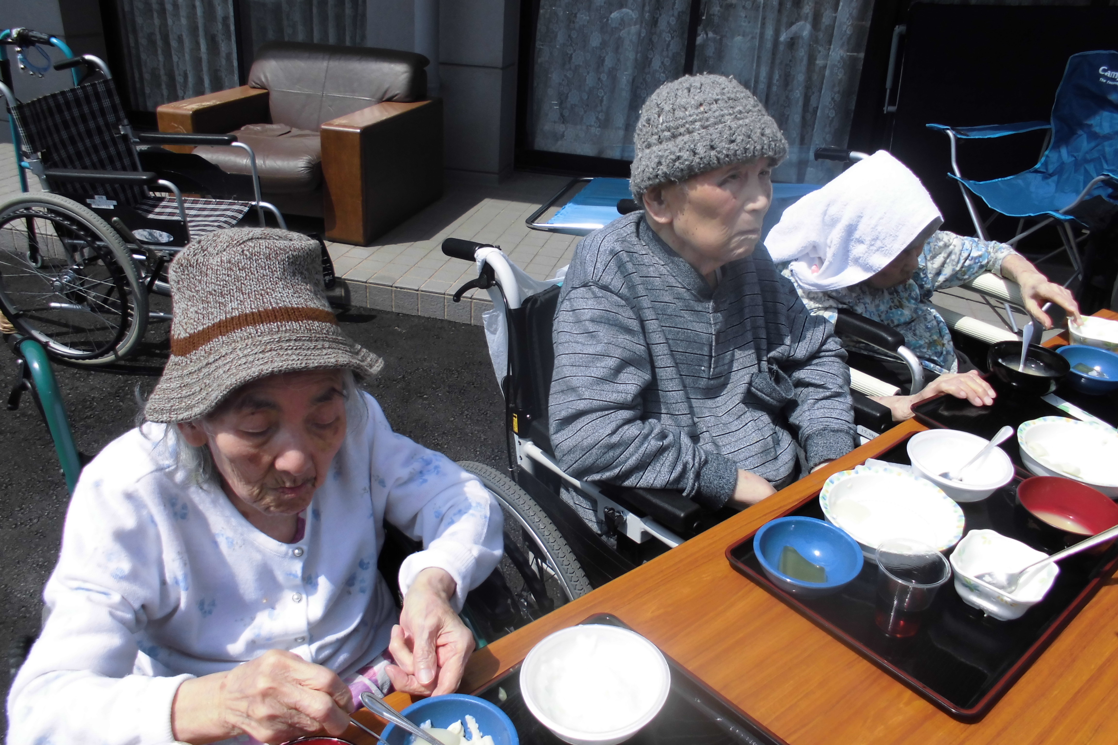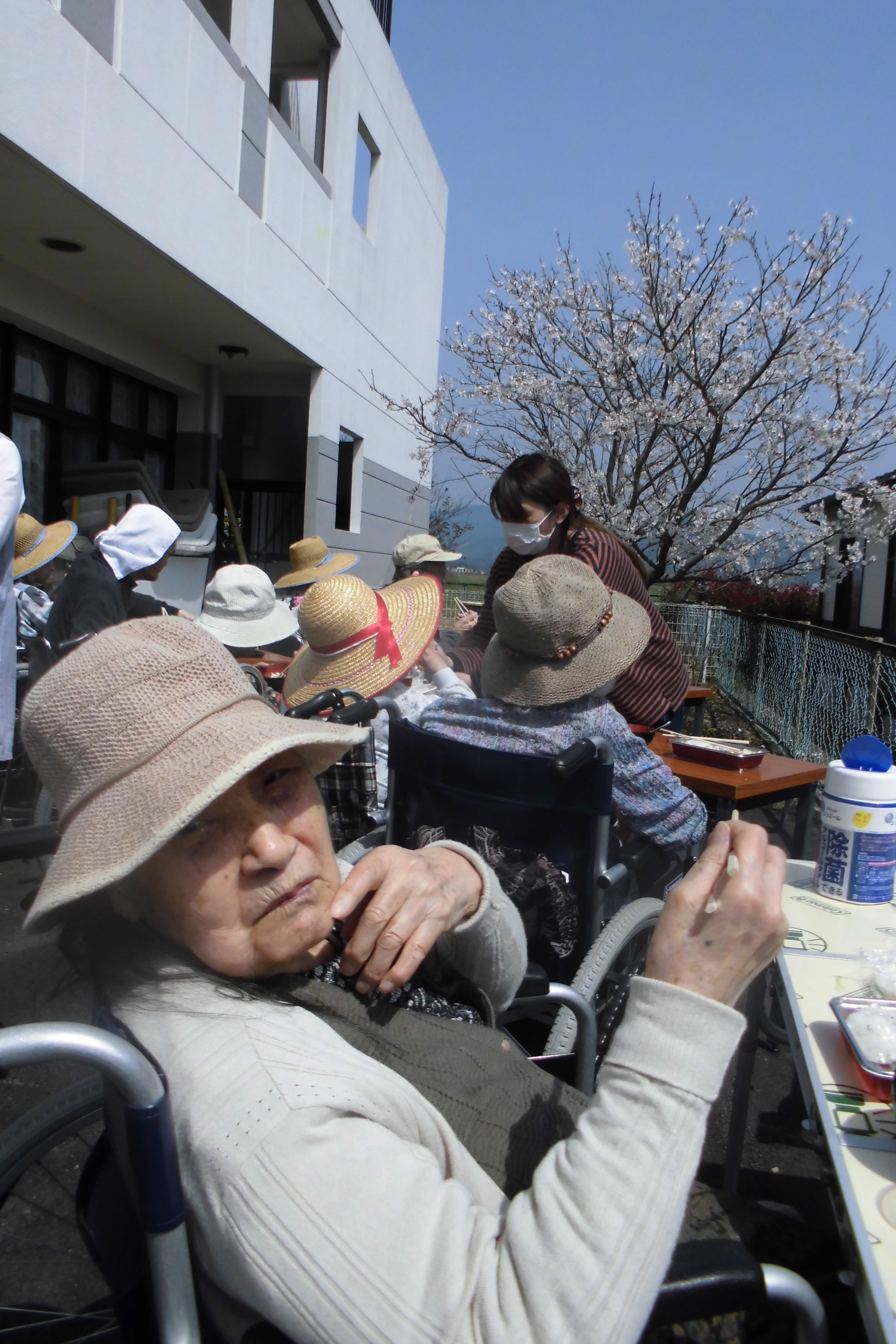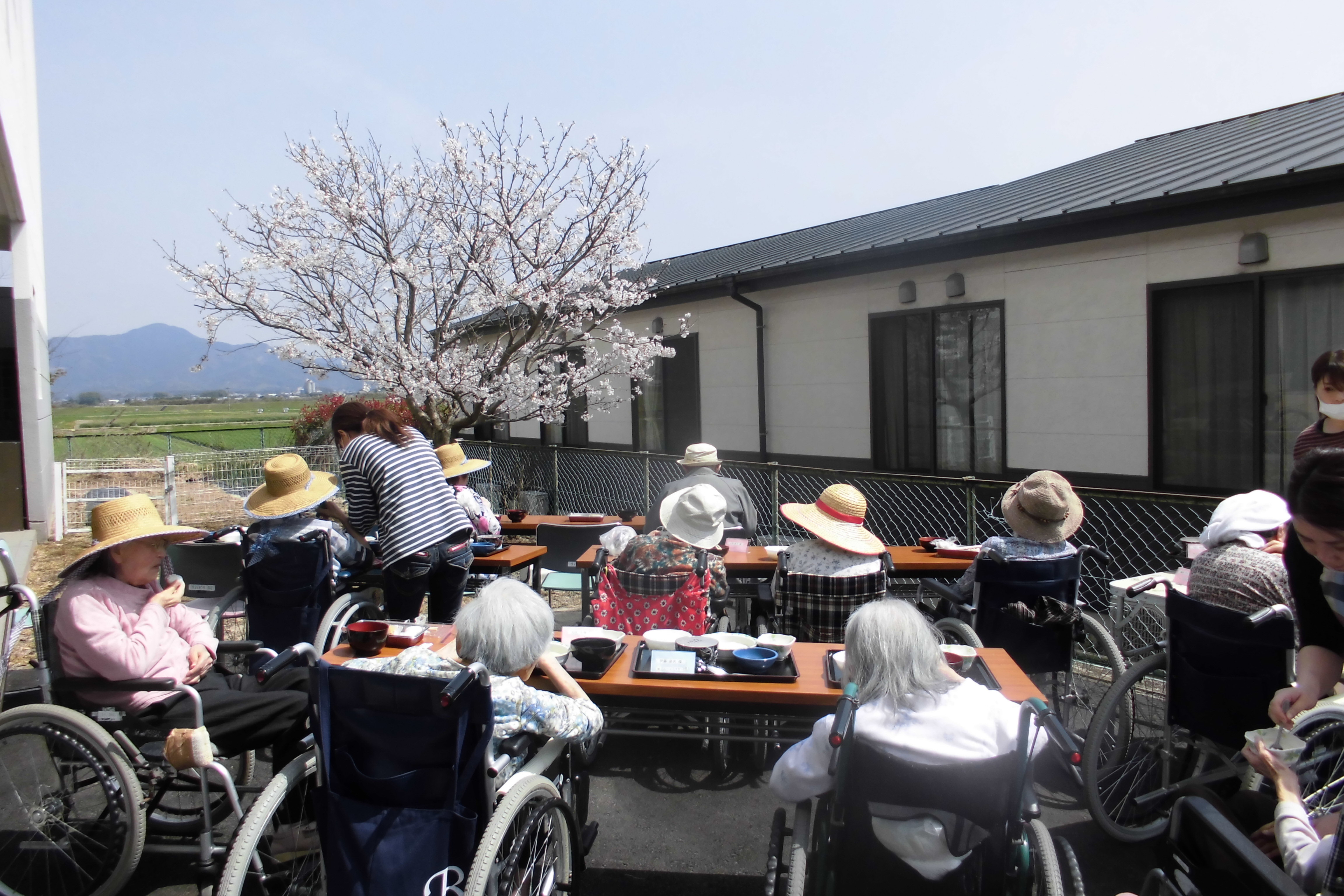 時間が経つにつれ、だんだんと気温が上がってきましたので、お食事の終わられた方よりお部屋に戻っていただくことになりましたが、一本の桜の木を眺めながら、馴染みの場所でのお花見は、入居者様にとって、心地よいもののように感じました。