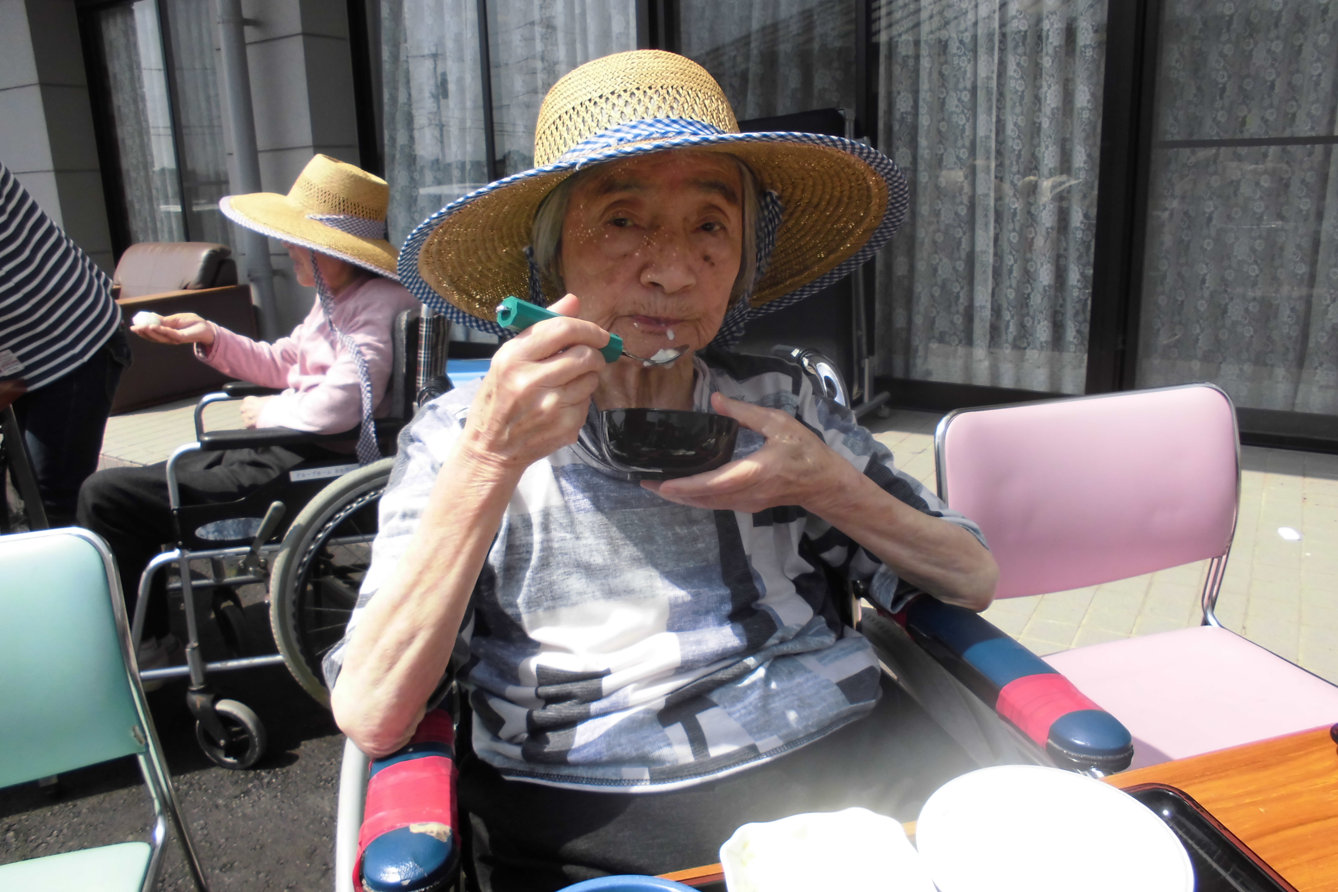 笑顔いっぱいのI様。最近、お食事が進まないこともあり、職員が介助させていただくこともありますが、今日の昼食は、ご自分で召し上がっておられ、嬉しかったです♪