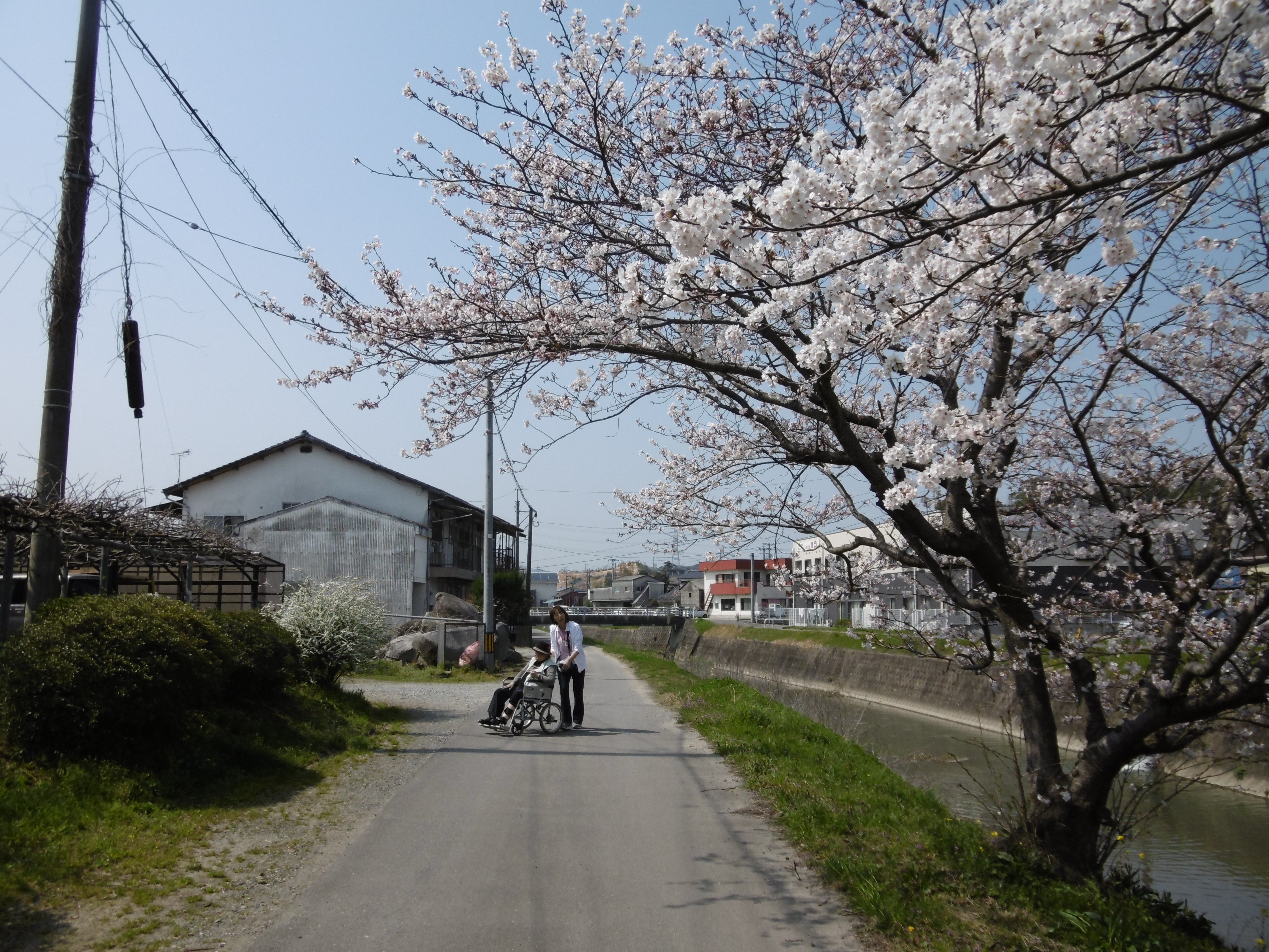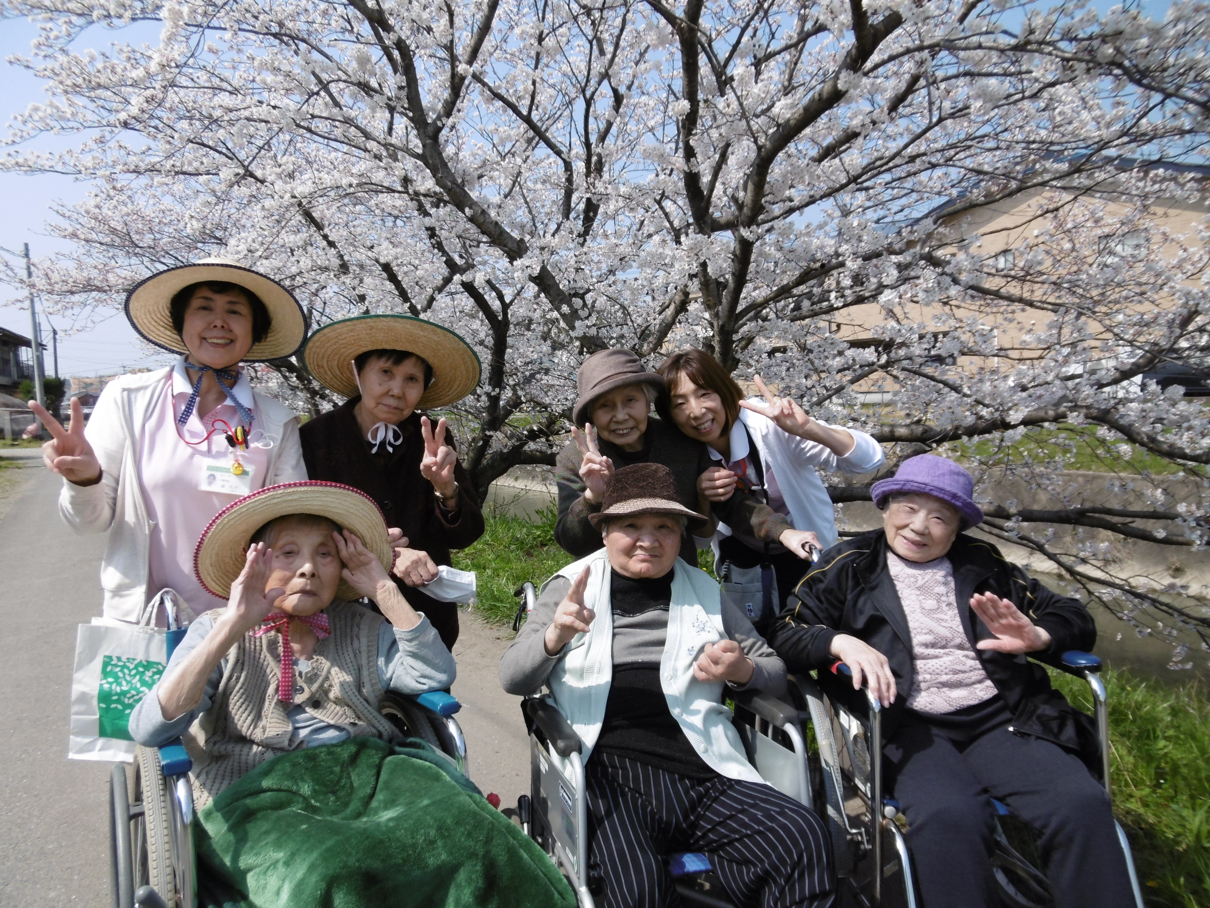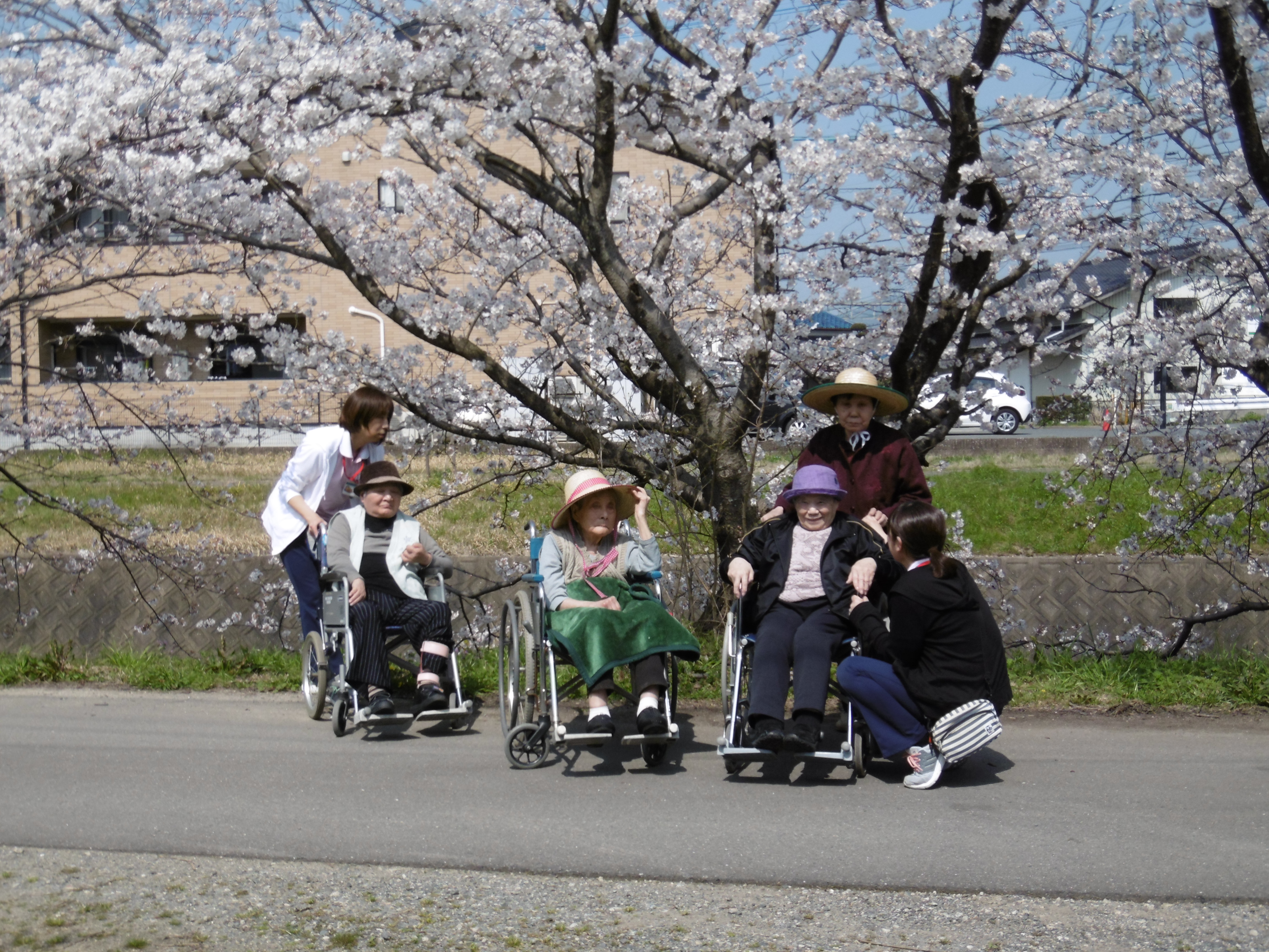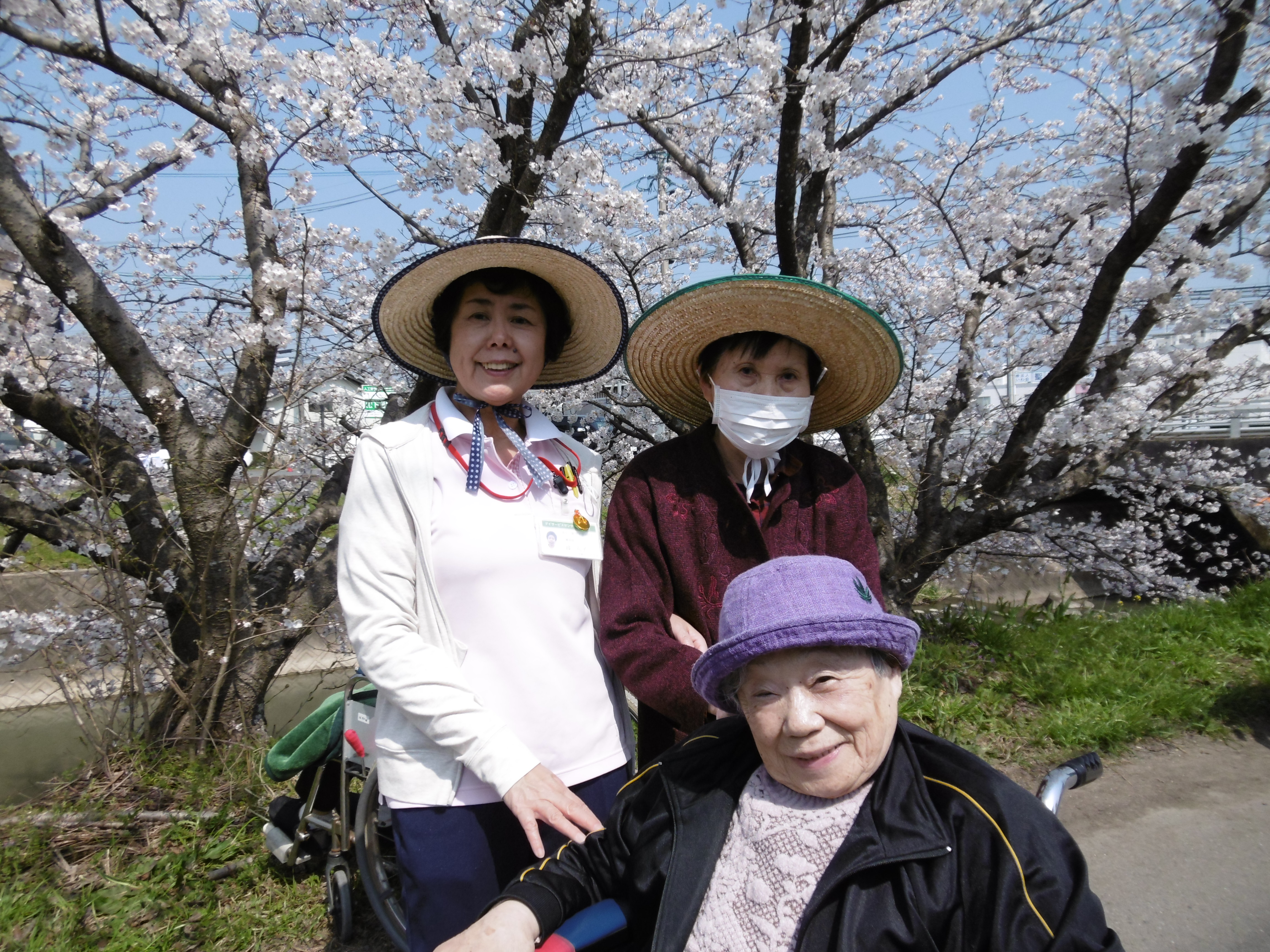 この日は温かいを越して‘暑い’がぴったりと利用者様から声が上がるほど、晴天の中のお花見になりました。