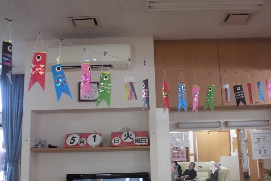 もうすぐ子どもの日ですが、庭先に鯉のぼりを飾られているお家もみられます。【おもやい】では、みなさまの健康と幸せを願い、【おもやい】特製鯉のぼりを飾りました♪