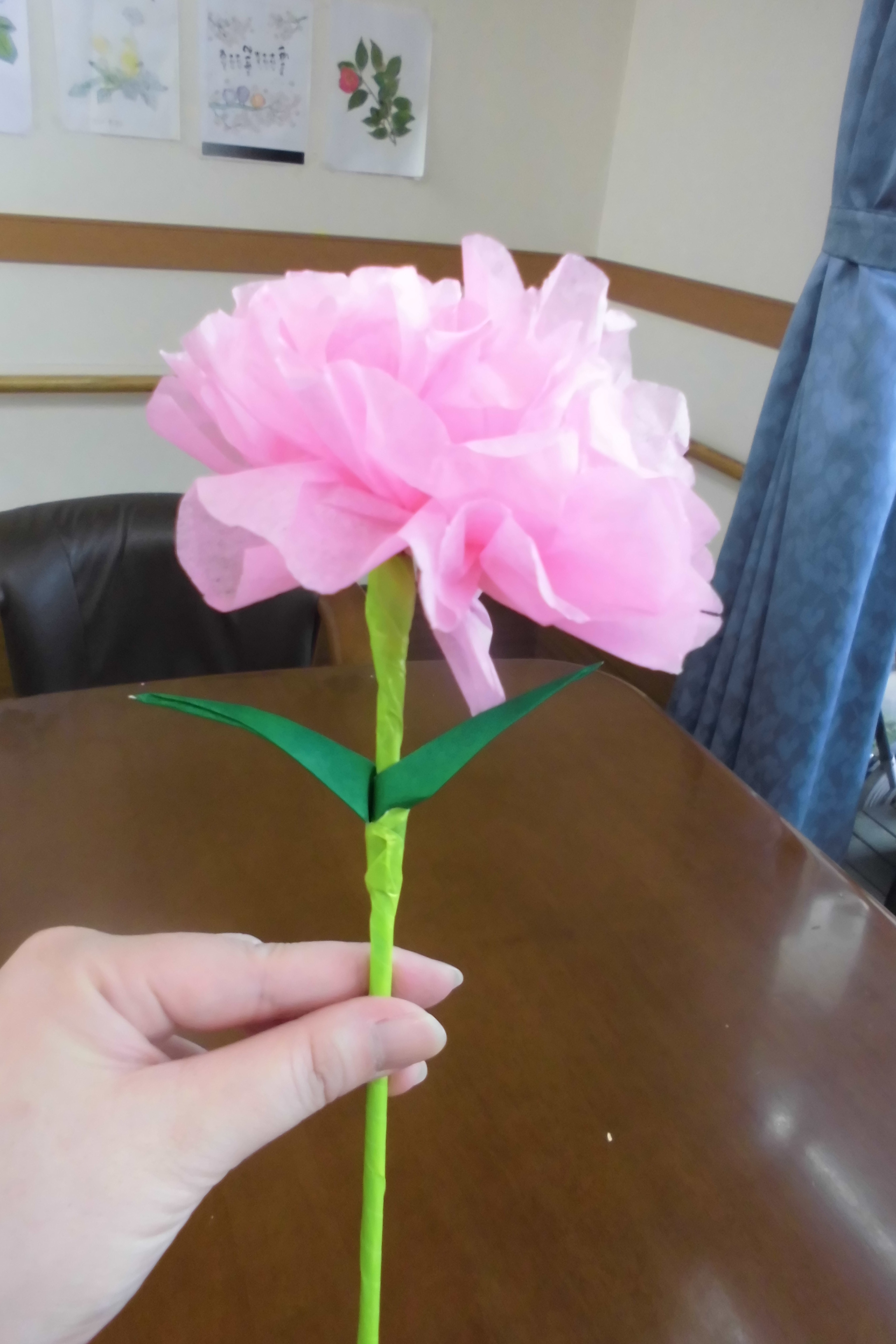 【おもやい】では、今月の行事担当の職員が、入居者様といっしょにお花紙でカーネーションを作りました。