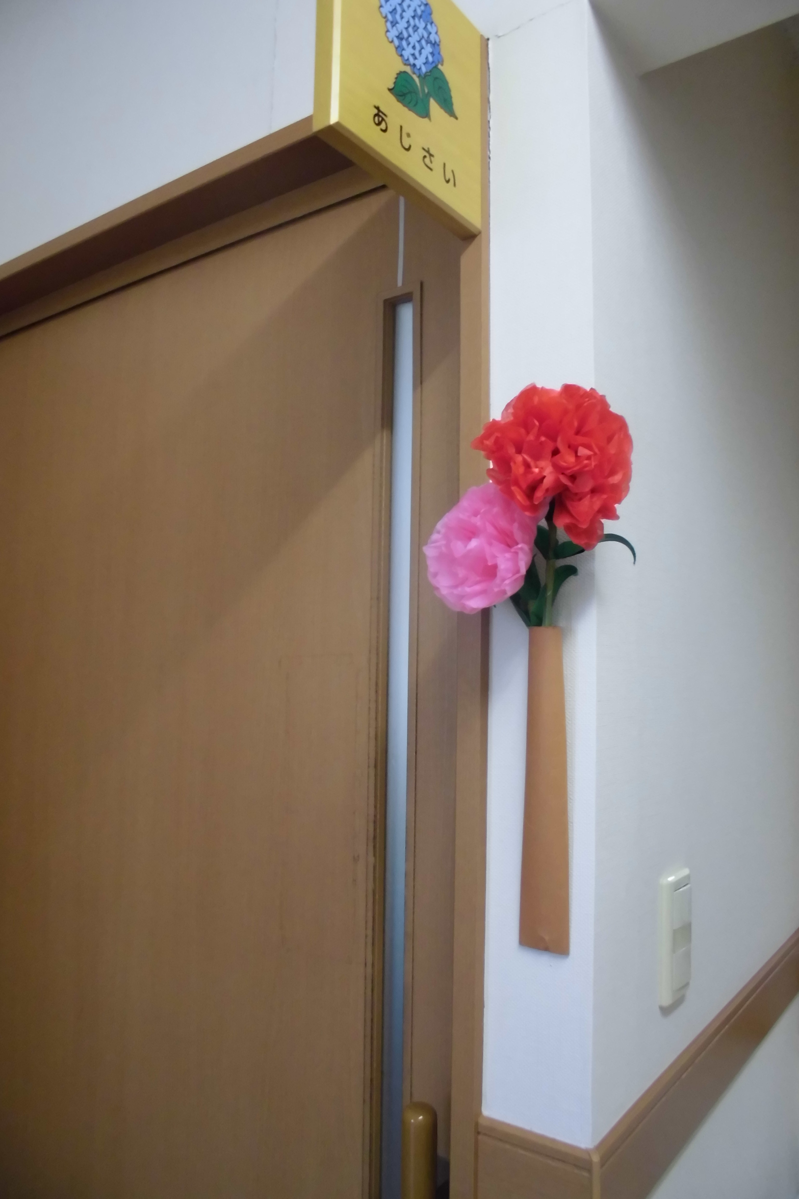 入居者様の各居室に作ったカーネーションを2本ずつ飾らせていただいております。