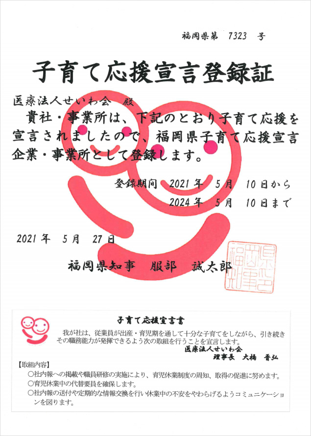 福岡県の子育て応援宣言事業所として登録されました 医療法人せいわ会 2018/05/24 15:59 医療法人せいわ会は、2018年5月10日付で福岡県の子育て応援宣言事業所として登録されました。 ⇒詳しくはこちら 次の記事へ 一覧に戻る 前の記事へ
