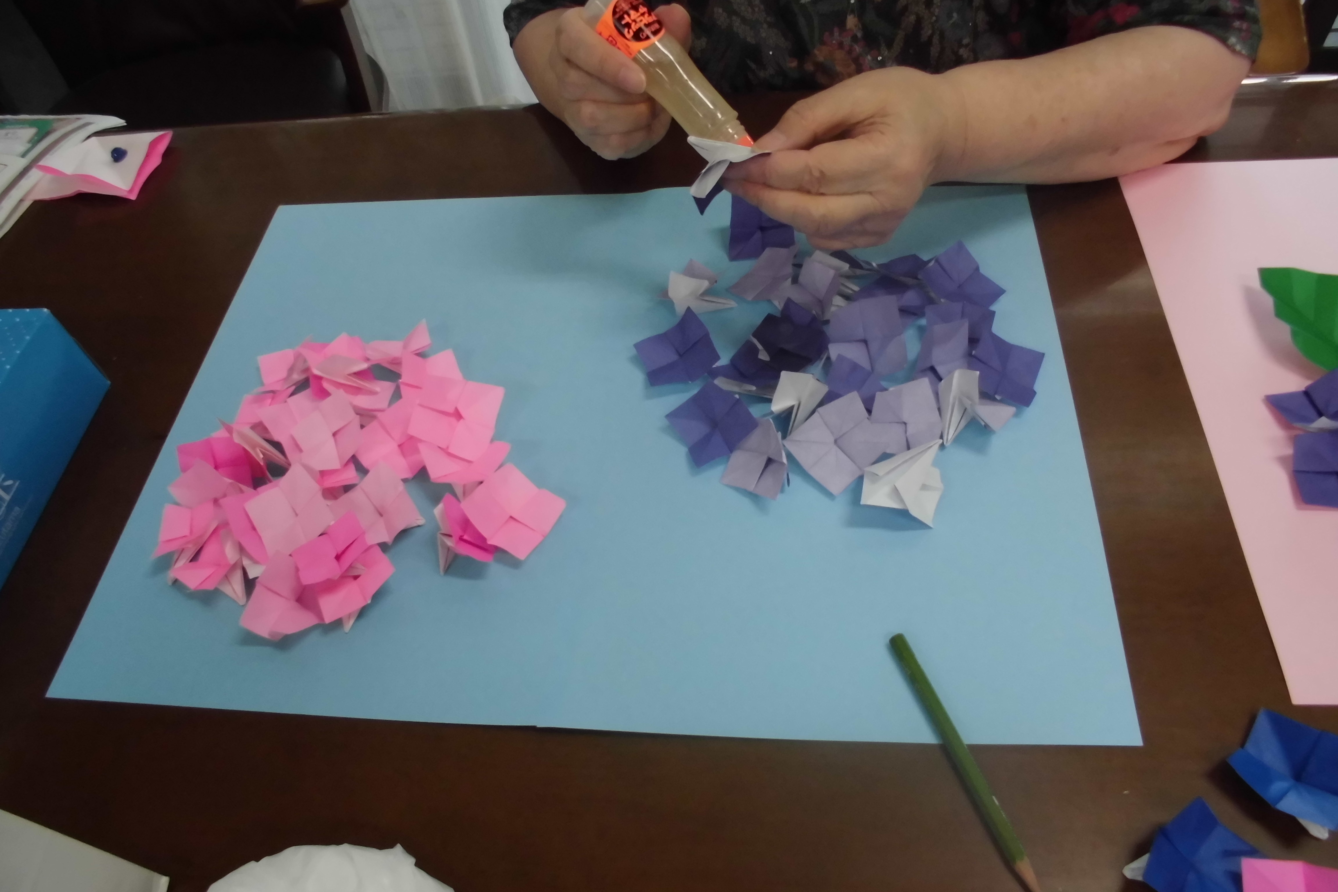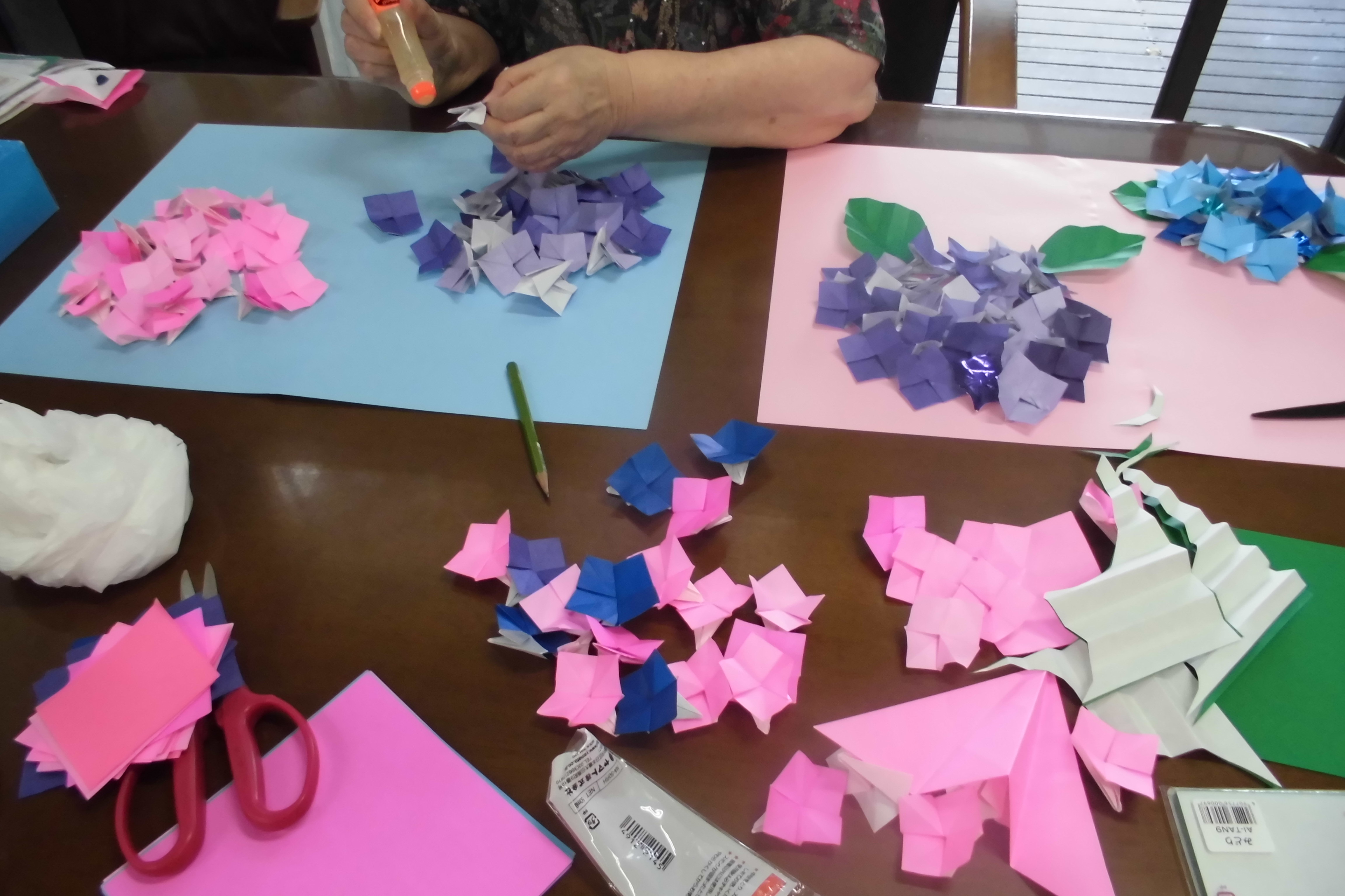 梅雨の季節になりましたが、あちらこちらで咲くピンクや青、紫などのあじさいが雨の日でも愉しい気もちにさせてくれますね。【おもやい】では、入居者様といっしょに、あじさいの貼り絵を製作をしました。