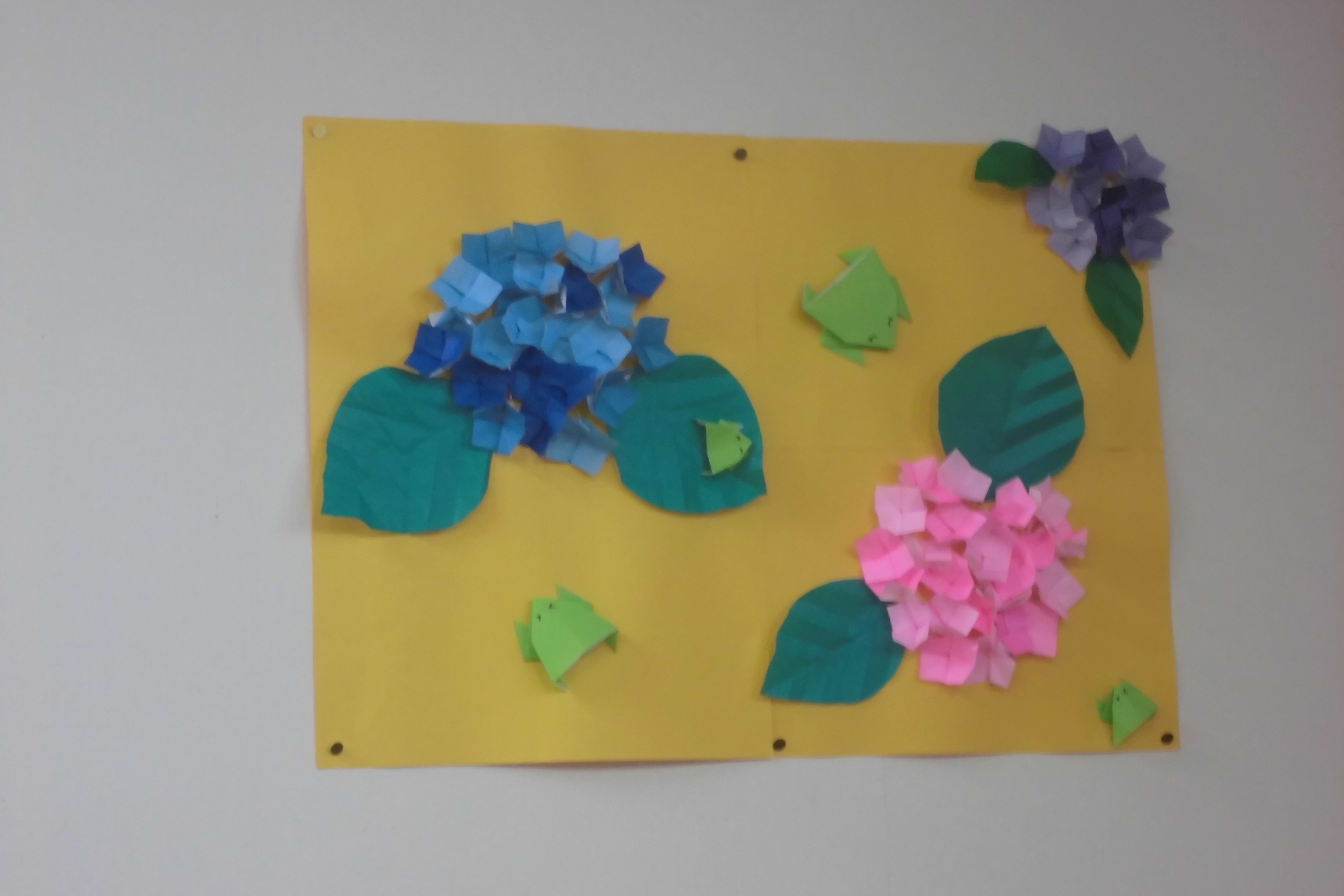 ピンクや紫、青の折り紙で、あじさいの花をたくさん作り、入居者様があじさいの形に貼ってくださいました。