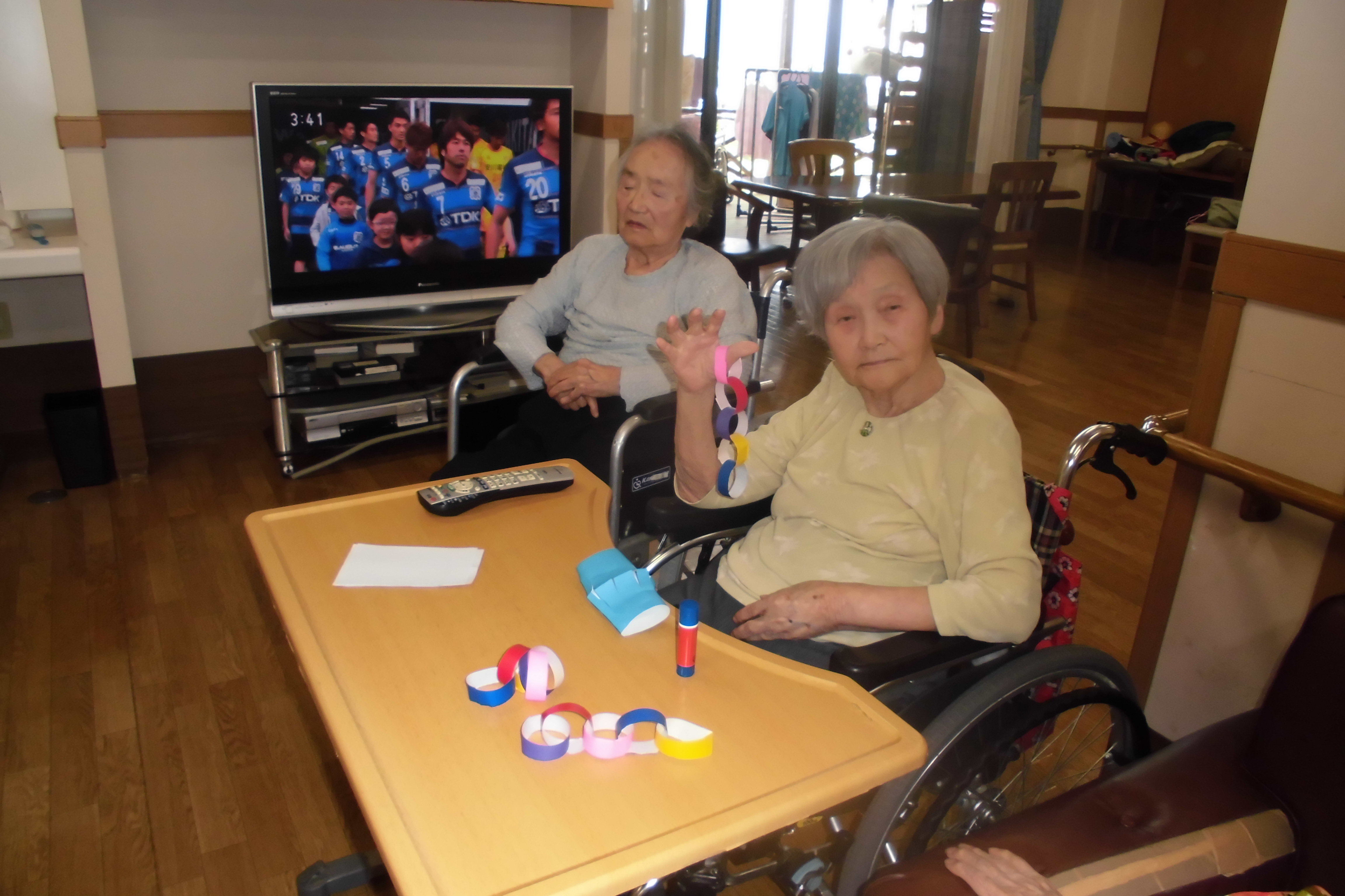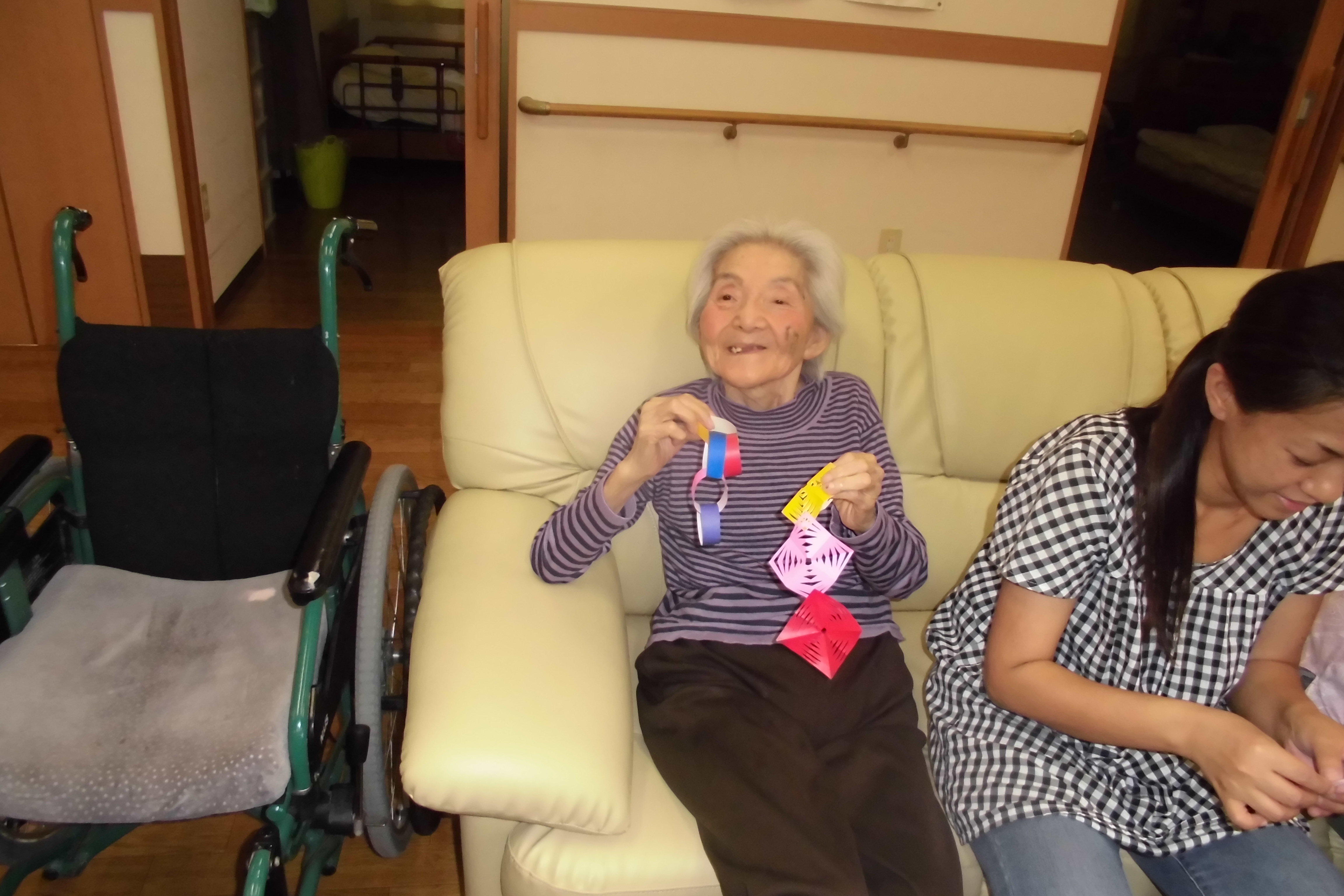 平成30年6月23日 七夕飾りづくり☆ おもやい 2018/06/23 12:00 もうすぐ七夕ですね☆ 【おもやい】では、入居者様にご協力いただいて、七夕飾りの準備中です。 折り紙を切ったり貼ったりして飾りを作っています。 入居者様には、のりで貼り付ける部分などをお手伝いしていただいています。 輪っかの飾り♪ きれいな飾りができて喜ばれるI様。 7月7日を心待ちにしながら、短冊に願いごとを書いたり、飾りづけをしていく予定です。 力を合わせて、すてきな七夕飾りを仕上げましょう! 次の記事へ 一覧に戻る 前の記事へ
