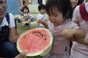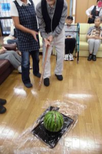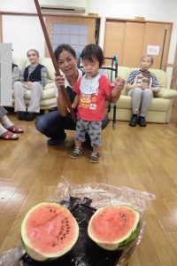 お昼ごはん前でしたので、割れたすいかは、園児さんたちには、おやつに持って帰っていただき、入居者様方には、3時のおやつに召し上がっていただきました♡