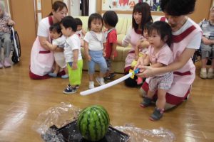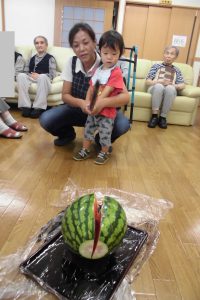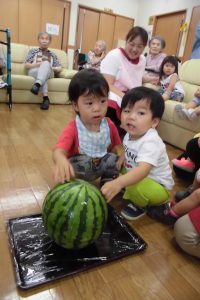 お昼ごはん前でしたので、割れたすいかは、園児さんたちには、おやつに持って帰っていただき、入居者様方には、3時のおやつに召し上がっていただきました♡