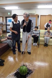 入居者様方が、すいかに立ち向かう園児さんたちを温かく見守られます。