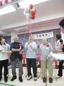 ご利用者様を代表し3名の利用者様にくす玉割りをお願いし、賑やかに会がスタート!!