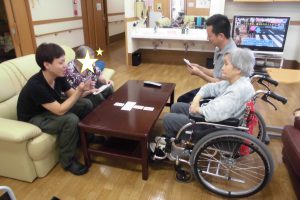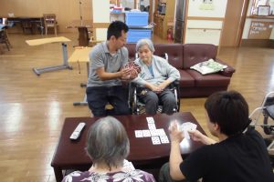 平成30年10月25日 レクリエーションでトランプ おもやい 2018/10/25 16:07 朝夕は冷え込んできておりますが、みなさまお変わりございませんか。 おもやいではお昼ご飯の後にトランプを楽しみました。 七並べでは隣に置く数字を「どれが置けるかな?」と、一生懸命に探してありました。 スタッフとチームになって楽しみました。 どれを出そうか…? すこしずつそろってきているカード☆ 次はあなたの番よ♪ トランプはやり方を思い出し、スタッフに聞きながらと、ゆっくり入居者様のペースで 楽しんで頂く事ができました。 次の記事へ 一覧に戻る 前の記事へ