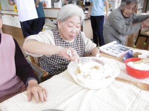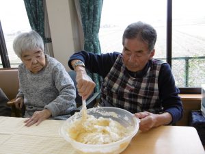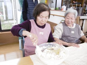 平成30年11月27日 さつま芋スフレ ひより 2018/11/27 12:55 久しぶりになってしまいましたが、26日おやつ作りを行いました。 日和で収穫したさつま芋をたっぷり使ったふわふわのスフレです。 利用者様にも大人気の1品です。 蒸かしたさつま芋を潰し、卵、バター、砂糖を加え、最後は泡立てた卵白と混ぜ合わせ生地は完成。 そしてオーブンで焼く事20分。 今日のおやつ作りも大成功!! コーヒーにぴったりの手作りケーキが完成しました。 せいわデイサービスセンター 日和 次の記事へ 一覧に戻る 前の記事へ