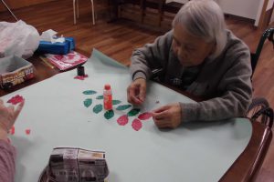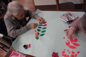 鉛筆で下書きをしたものに、ちぎった折り紙をのりで丁寧に貼り付けていってくださる入居者様。