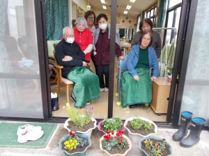 植えてくださった鉢は、ご利用者様がいつも出入りされるドア付近に置かせていただいております。皆さん、「きれいねえ。」と言っていただくなど、お花を楽しんでいただいているようです
