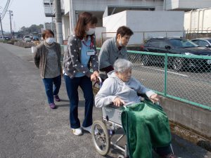日和では、通常、午後より、施設内を歩く“歩こう会”を実施しておりますが、今日は、とてもいいお天気でしたので、ご利用者様をお誘いし、散歩に出かけました。