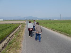 麦畑に囲まれた長い道をご利用者様とお話しをしながら、楽しく歩きました。