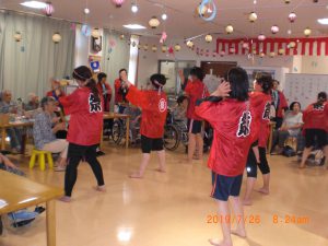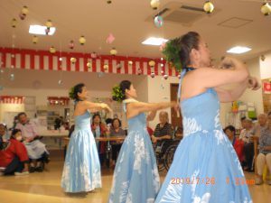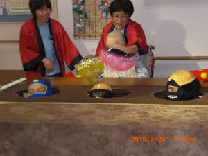 2019年8月2日 まどい夏祭り まどい 2019/08/02 18:12 7月26日に5回目となる夏祭りを行いました!(^^)! ボランティアによるフラダンス(^^♪から始まり もぐらたたき! 職員もぐらは利用者様にたたかれます。 結構、痛いです(>_<) 最後はソーラン節でバッチリ締まりました(^_^)v 準備では毎年の団扇に加え、今回は提灯も手作り(^O^) 職員が一つ一つ心を込めて作りました(^o^)/ 数が並ぶと、お祭りの雰囲気が良くでました(^^)/~~~ 次の記事へ 一覧に戻る 前の記事へ