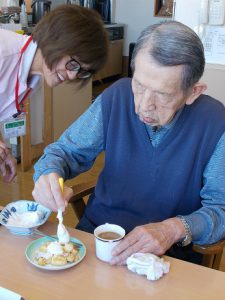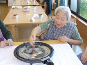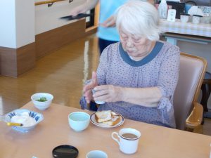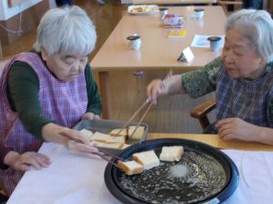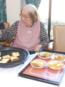 今回は、卵液に浸して準備しておいたパンを、ご利用者様方に焼いていただきました♪