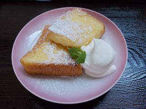 お皿に盛り付けられたフレンチトーストの上に、粉糖をぱらぱら・・・(*‘∀‘)