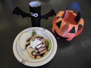 おやつのメニューはハロウィン特製のパンケーキでした。