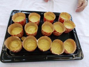 カップに生地を入れてオーブンで焼きます。