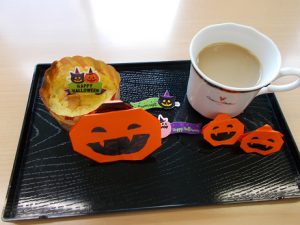 焼き上がったら、オーブンから取り出し、ご利用者様と折り紙で作ったジャックオランタン🎃を添えます。