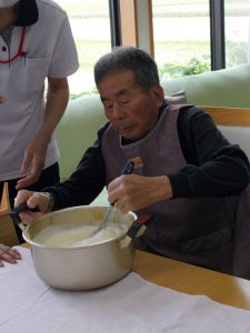 一人が鍋をしっかりと押さえてくださり、一人が混ぜ合わせをお手伝いくださいました♪
