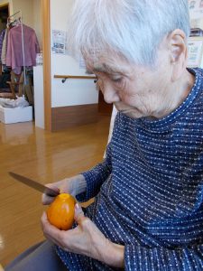 ご自宅では、みそ汁の具材を切られてお手伝いされているというS様に、早速、皮むきをお願いをさせていただきました。慣れた手つきで、柿の先のほうからきれいに剥いてくださりました♪