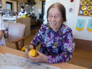 こちらのご利用者様もするすると楽しそうに皮を剥いてくださり、また、男性のご利用者様もお手伝いくださったりと、あっという間にたくさんの柿が剥き上がりました(*^-^*)