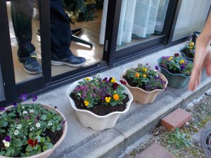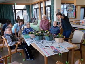 ビオラなどの花を利用者様と一緒に買いに行き🚙、みんなで、プランターに植えました。