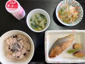 9月の院内行事食~「敬老の日」 聖和記念病院 2020/09/29 17:18 当院は入院患者さんの健康増進を踏まえた、安全で心温まるおいしい食作りを心がけております。今月は「敬老の日」と「月見」に合わせて特別メニューとおやつをご提供しました。 食事を楽しくおいしく味わってもらえるように今後も頑張っていきます。 敬老の日は「お赤飯」で長寿をお祝いしました。 みかんとぶどうのゼリーでお月様とうさぎを表現しています。 目でも楽しんで頂けるに工夫しています。 次の記事へ 一覧に戻る 前の記事へ