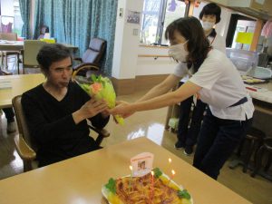 他のご利用者や職員からお祝いの言葉をかけられ、とても嬉しそうにされ、私達職員も嬉しかったです♪