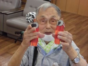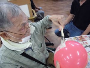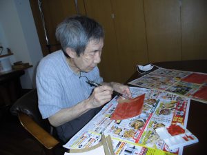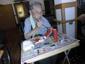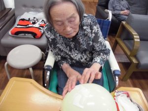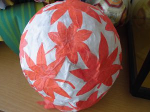 風船に和紙を糊で全体に貼り付けて行き、その上に