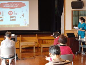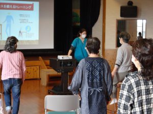 『健康寿命を延ばそう~いつまでも自分の足で歩くために~』をテーマに、ロコモティブシンドローム(運動器症候群)の基礎知識の講義をはじめ、簡単な筋力テスト・準備体操・トレーニングなどの実技を行いました。