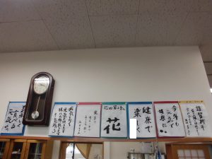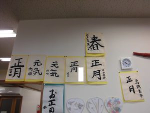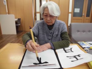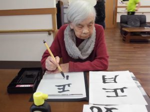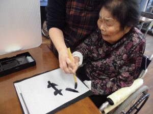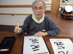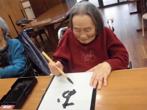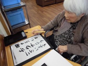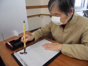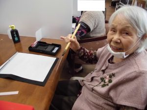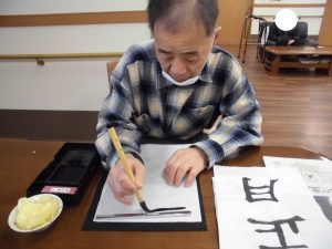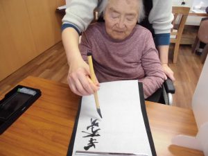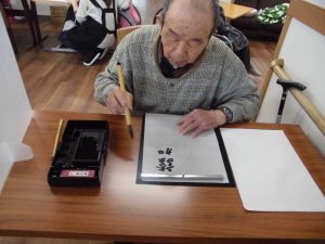 書初め おもやい 2021/02/06 9:13 2021年1月1日の午後から書初めを 皆さんと一緒に行いました。 新年の挨拶やお願い事、スタッフが書いた 文字を清書したりと自由に書かれていました。 スタッフもお手伝いさせて頂きました。 皆様が書いた書初めはフロアの壁に展示してあります。 (西棟フロア) (東棟フロア) 「何を書こうか?」とたくさん悩まれてあり、練習して 一番上手に書けた作品を選ばれてありました。 グループホーム おもやい 次の記事へ 一覧に戻る 前の記事へ