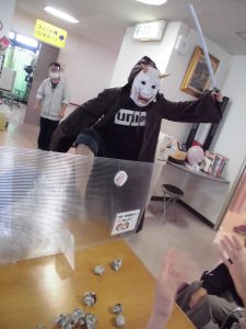 豆の代わりに、新聞紙を丸めたボールと武器で戦って下さいました。
