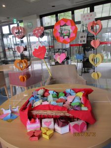 折り紙で作った可愛いハートやケーキの箱にチョコが入っており、