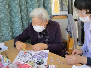また、2月よりご利用者と一緒にちぎり絵で“壁面飾り”を作成しました。