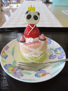 菱餅をイメージしたピンクと緑のロールケーキの上に、パンダのお雛様をご利用者と一緒に作りました♪