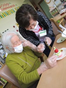 日和では、3月3日は、ご利用者と一緒にロールケーキや苺を使った“雛ロール作り”を行って、“雛祭り”を楽しみました。
