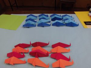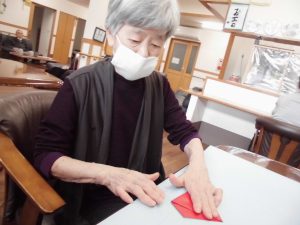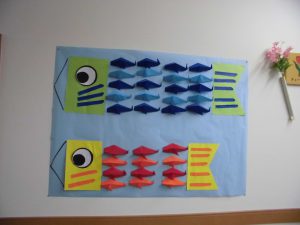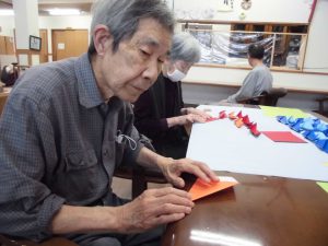手作り鯉のぼり🎏①(東棟) おもやい 2021/04/30 21:09 2021年4月にこいのぼりのを手作りしました。 入居者様と一緒に、折り紙を魚の形に折り、 ウロコ部分を作って行きます。 初めは苦戦しましたが、途中からは慣れた手つきで 折ってありました♪ 細かい作業でしたが、何日間かに分けてたくさん 作って下さいました。 出来上がった折り紙を模造紙に貼っていきます。 頭としっぽを付けて完成です! 入居者様の手作りこいのぼりは、東棟の壁に飾らせて 頂きました♪ グループホーム おもやい 次の記事へ 一覧に戻る 前の記事へ