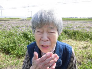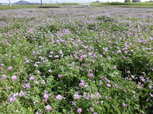 おもやいを出て右に曲がると左手にきれいなレンゲ草が