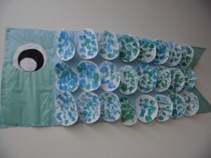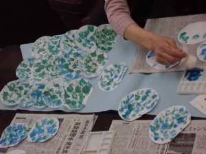 ウロコの形に切った白紙にスタンプを押して青や緑色、