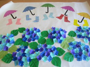 日和では、ご利用者と一緒に、“紫陽花”の壁画を作り、日和内でも季節を感じていただいております。