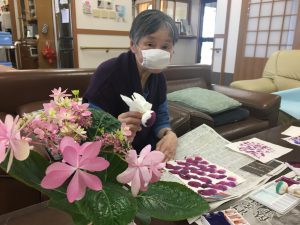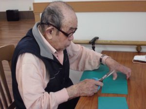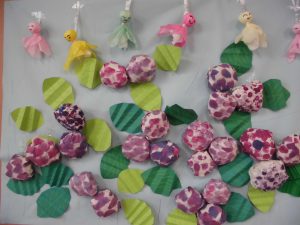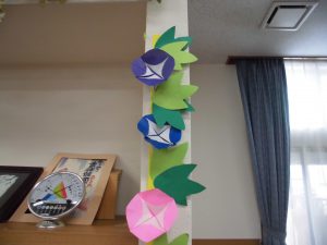 緑や黄緑の画用紙を葉っぱの形に切って、山折り