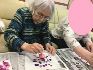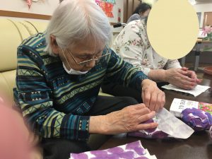 スタンプした紙で丸めた新聞紙を包んでいきます。