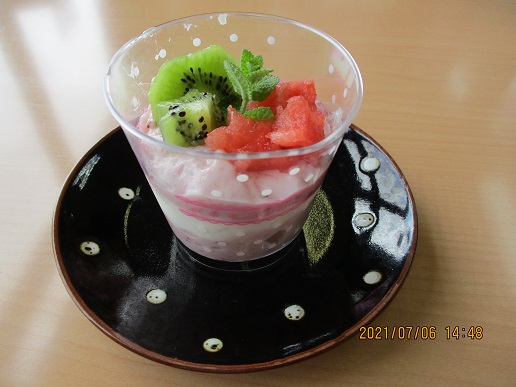 “七夕パーティー”では、フルーチェを使用した七夕をイメージしたおやつ作りを行いました。