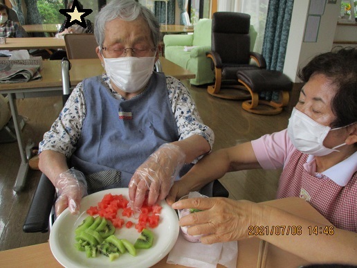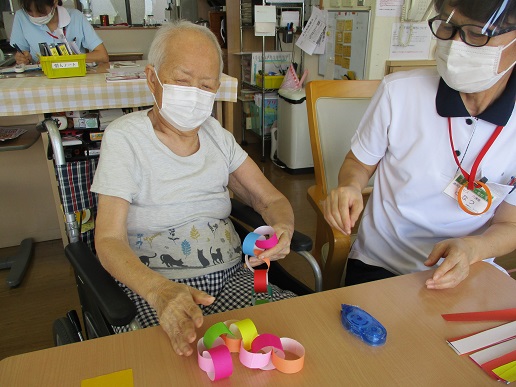 七夕飾り作りでは、七夕に関する話をなどをしながら、お一人、お一人、出来る作業に取り組まれ、