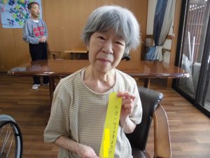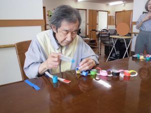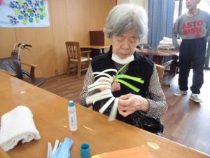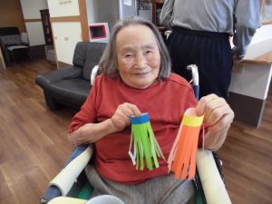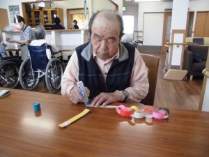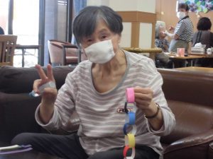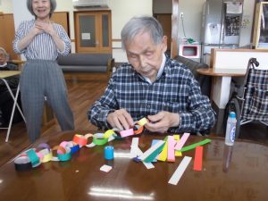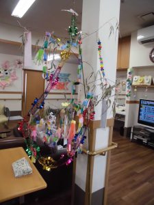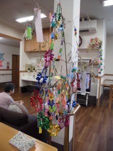 七夕飾り おもやい 2021/07/24 16:18 2021年7月に七夕の飾りつけを行いました。 事前に短冊に願い事をに書いて頂き、輪っかや 天の川などの飾りを作製しました。 皆様、折り紙で器用に作られていました。 「元気になりますように」「健康でありますように」と それぞれ皆様願い事を書いて笹の葉に飾っていきました♪ 今年も綺麗な七夕の飾りつけが出来て良かったです。 グループホームおもやい 次の記事へ 一覧に戻る 前の記事へ